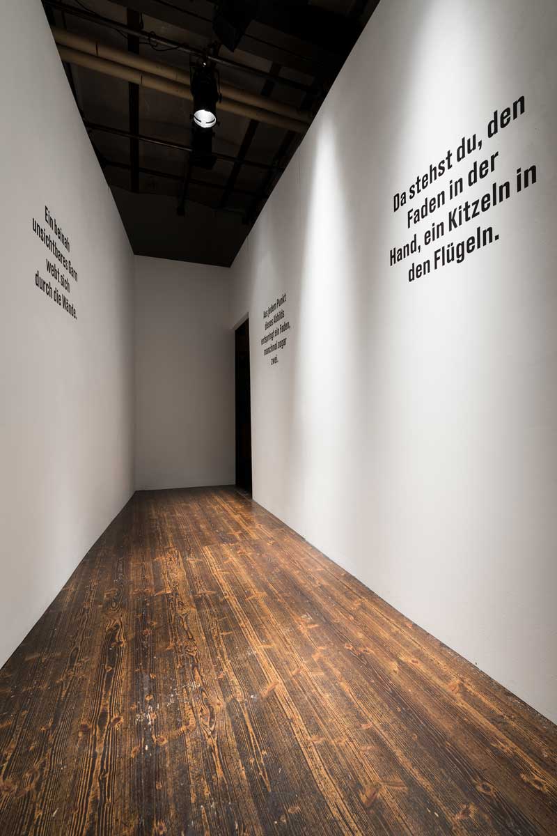 Beide sind mit einigen Sätzen aus dem Stück verziert und führen in den Hauptraum hinein: einen dreieckigen völlig schwarz gestrichenen Raum.